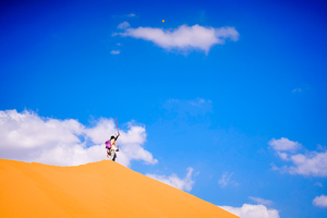 越往沙漠深处走,看到的越来越美丽,那些没有被越野车车轮压过的沙丘就像一幅完整的布疋,让人忍不住的想要去抚摸它却又怕会破坏了它的夸姣。金黄色的沙丘衬托着蔚蓝色的天空,不用润饰,这自身就现已是一副极致的著作。