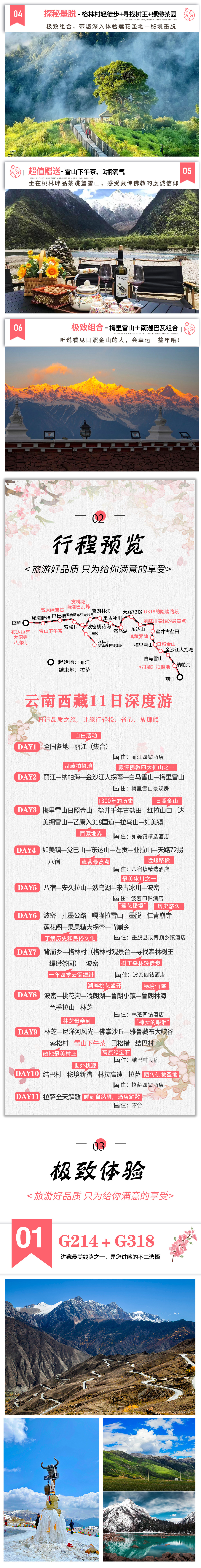 6.【贴心安排】全程不走回头路,丽江集合,拉萨解散,留充裕时间继续探索拉萨市区及周边美景。中国十大最美雪山之二的梅里雪山+南迦巴瓦组合。