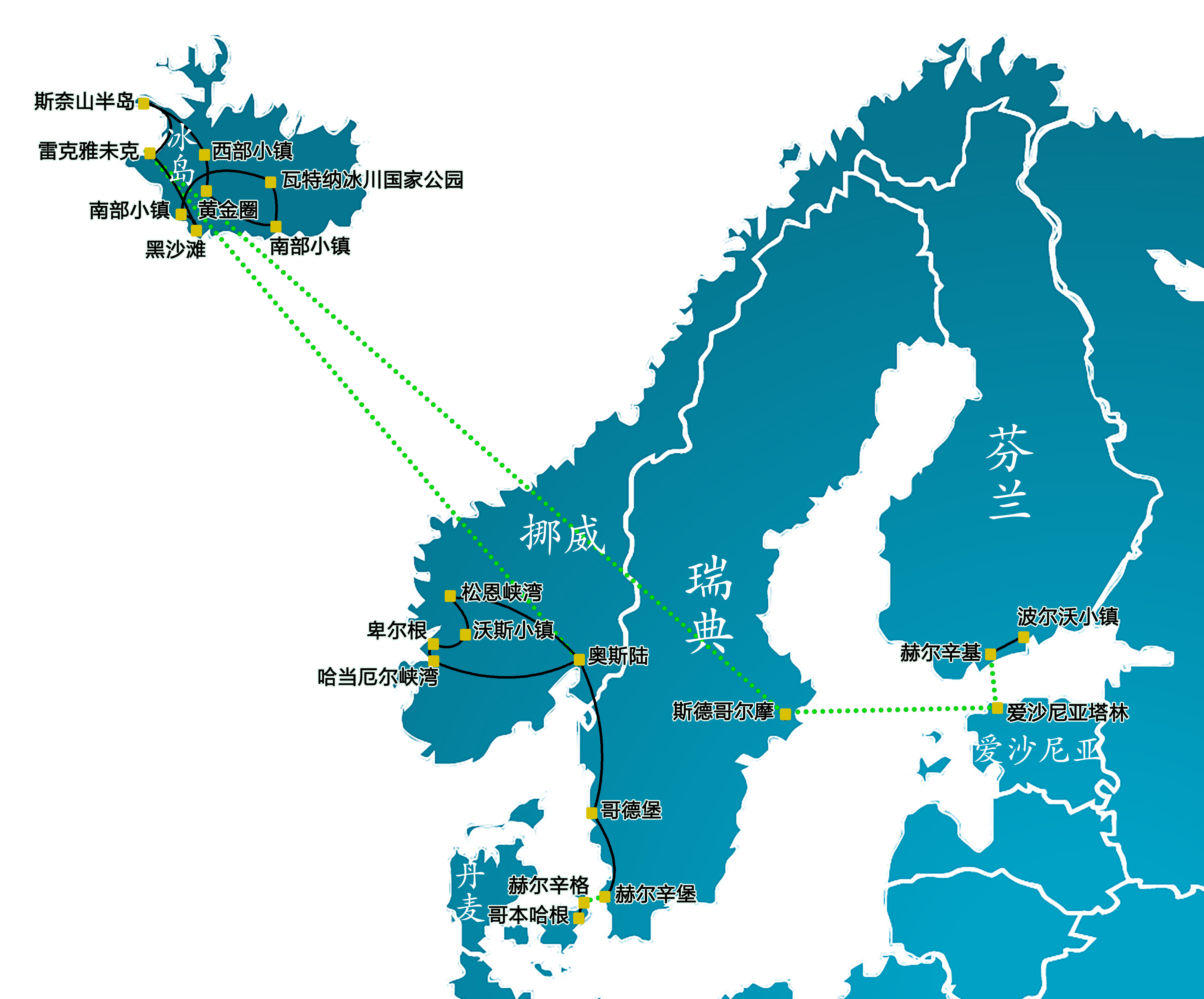·环形链路·一网打尽:丹麦哥本哈根→赫尔辛格→瑞典赫尔辛堡→哥德堡→瑞典奥斯陆→松恩峡湾→沃斯小镇→卑尔根→奥斯陆→冰岛雷克雅未克→黄金圈→南岸→冰川→瑞典斯德哥尔摩→爱沙尼亚→芬兰赫尔辛基→波尔沃→芬兰堡,经典景点全覆盖,耗时多年打磨、迭代的独家线路。