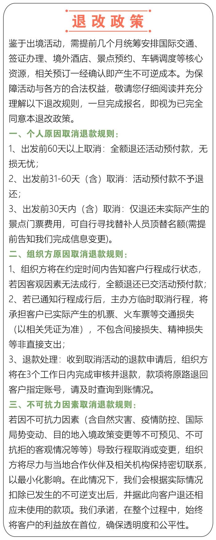 5、活动尾款需在活动开始前45天内支付完成,谢谢!若签证原因拒签,我们将全额退还活动预付费用。