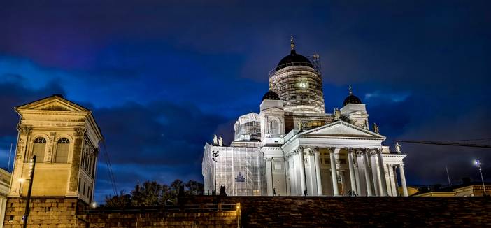 赫尔辛基的地标性建筑。“白色地标”,希腊复兴式建筑的典范。纯白外墙搭配绿色穹顶,九尊圣徒雕像伫立顶端,庄重而典雅。教堂广场是城市心脏,夏季鲜花簇拥,冬季白雪覆盖,无论晨昏,登顶俯瞰全城红顶与波罗的海风光,皆是明信片般的风景。