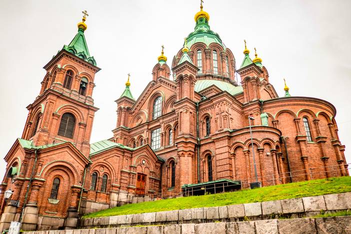 外观的金绿圆顶和红砖墙很为醒目,具有俄罗斯的建筑风格。教堂的颜色和式样都充满着神秘的色彩。乌斯别斯基东正教教堂位于赫尔辛基市中心,它的十三个金顶,与古雅红砖外墙,在赫尔辛基城市轮廊间,突显一抹俄罗斯在芬兰宗教上所留下的遗痕。显眼的金圆顶和红砖成的教堂显得格外凝重,边两大树与教堂交相辉映,正好是俄罗斯风情渗入芬兰历史的见证。精雕细琢的拱顶和花岗岩石柱是乌斯本斯基大教堂的两大特色,教堂内部的绘画都是由俄国画家完成的,完全保留了传统东正教堂的艺术风格,城内富有特色的建筑和博物馆数不胜数。