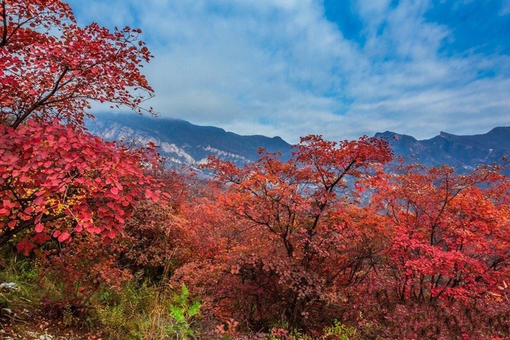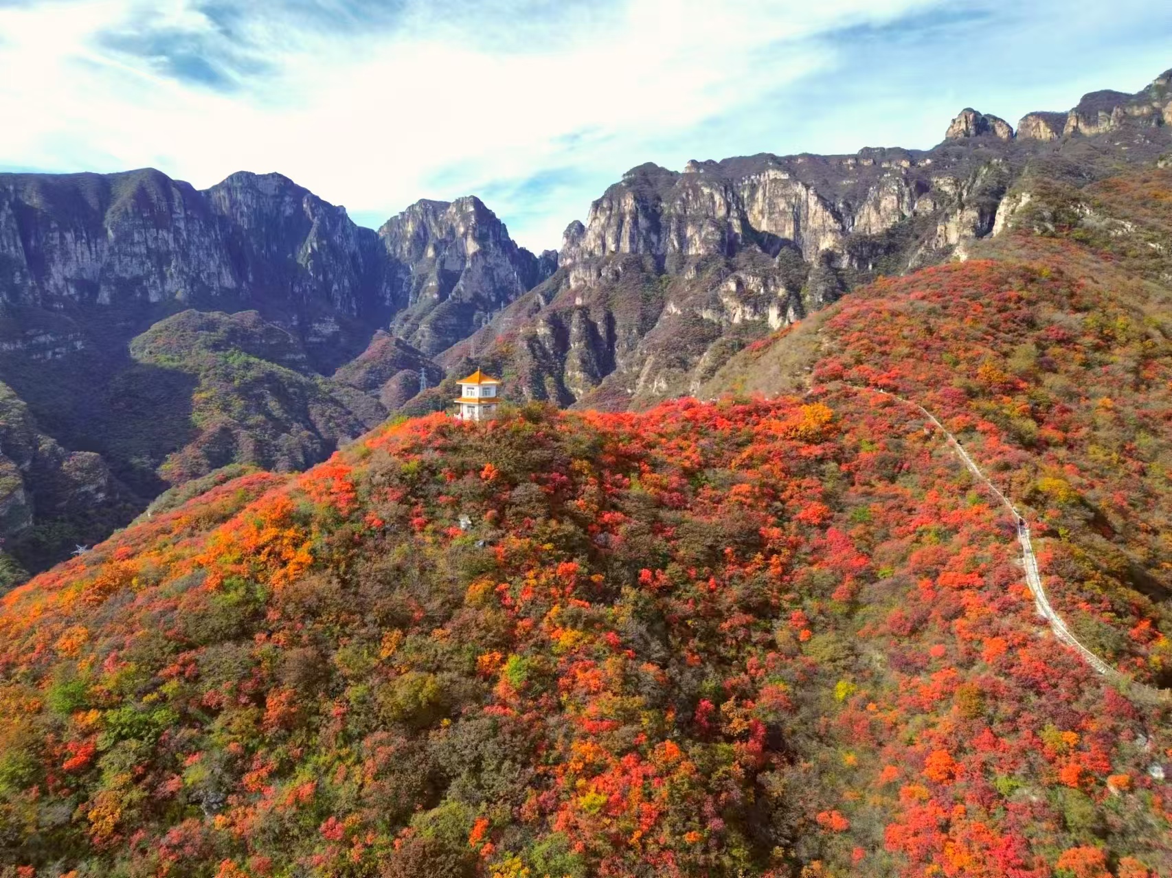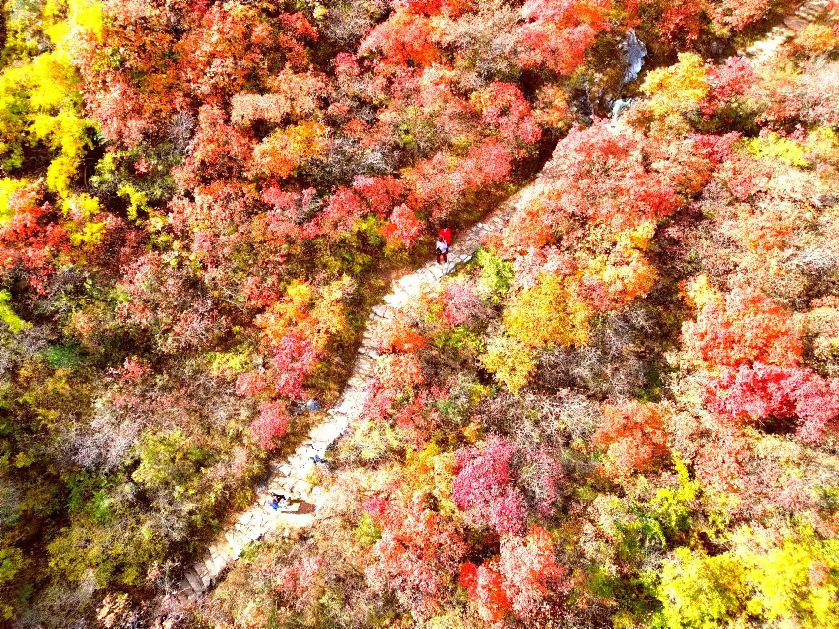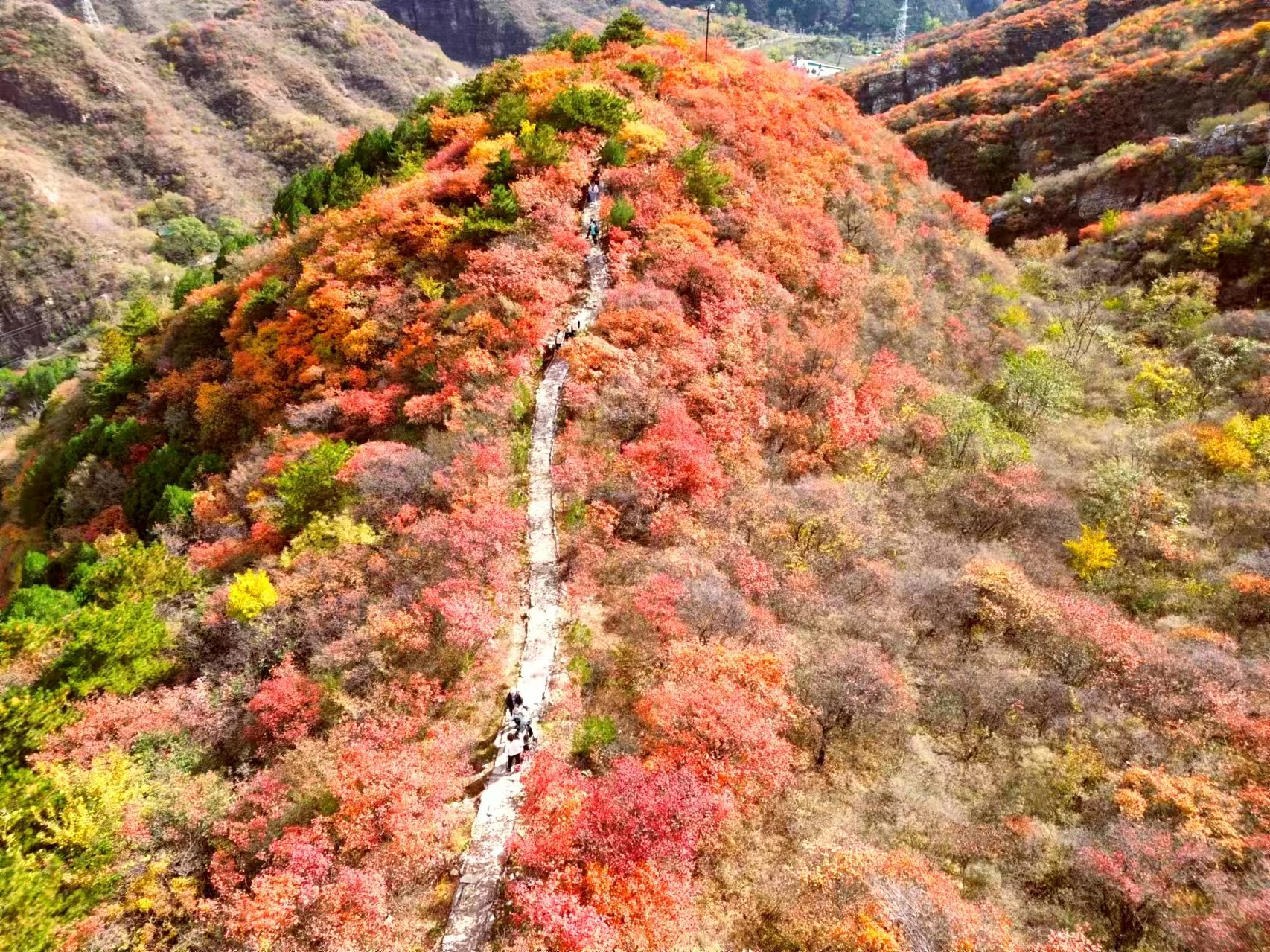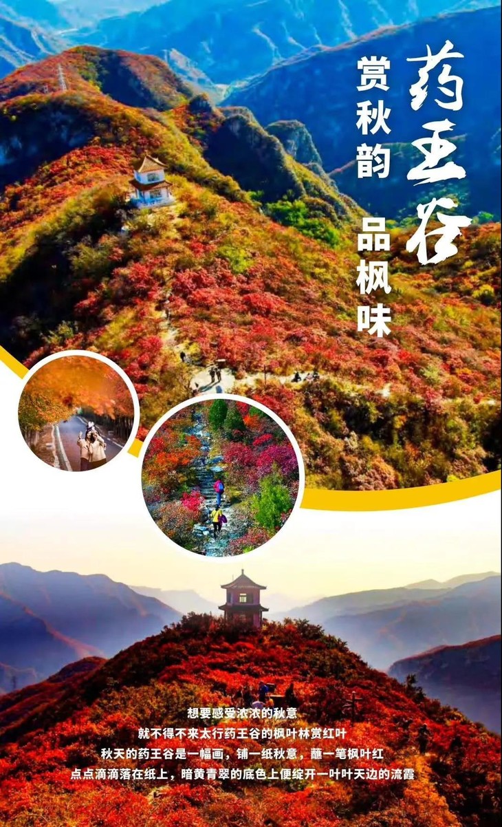 10:30➤左右到达泗马沟•药王谷景区,进入樱桃谷登山步道,一路赏美景拍照。漫步在蜿蜒的石道,红叶随行,连绵起伏的山峦上,橙黄红绿,煞是热闹。沿路看秋,叶比花娇,居高远眺,目光所及尽是惊喜。簇簇红叶与茫茫云海相映成趣,云腾山浮,飘渺如画,不同树种的叶子,红黄交错,视觉由远及近,颜色由黄绿相间转向浓红淡黄,迥然不同的色彩,放眼望去层峦迭嶂红叶漫山,把整个药王谷点缀的如童话仙境般美妙。药王谷红叶几乎全都是黄栌,其壮观但却并不单调,因为起起伏伏的山脉,自然随性生长。
