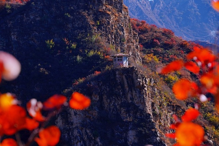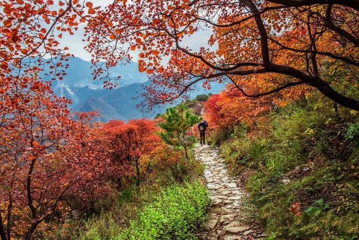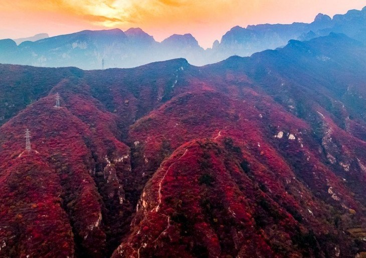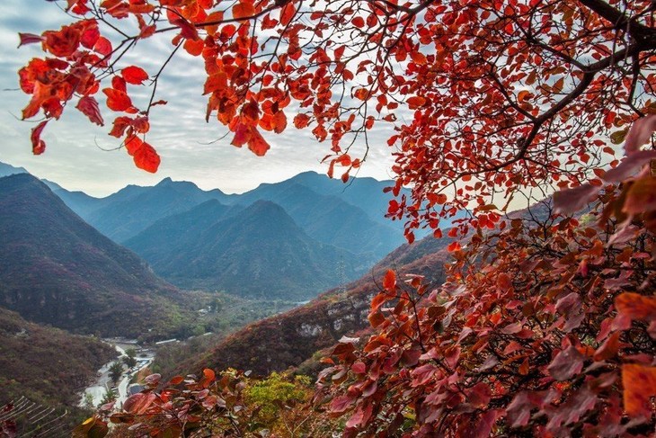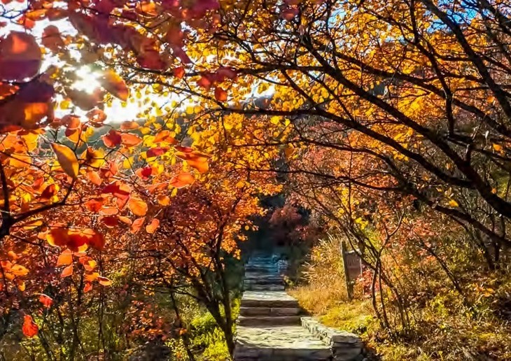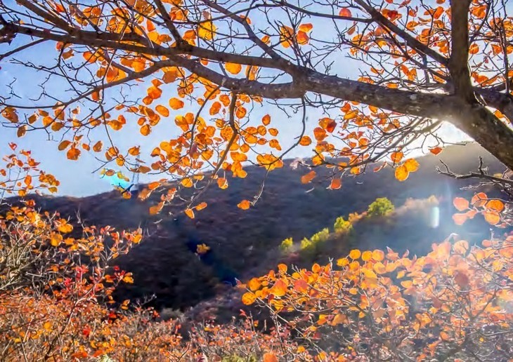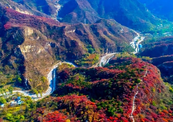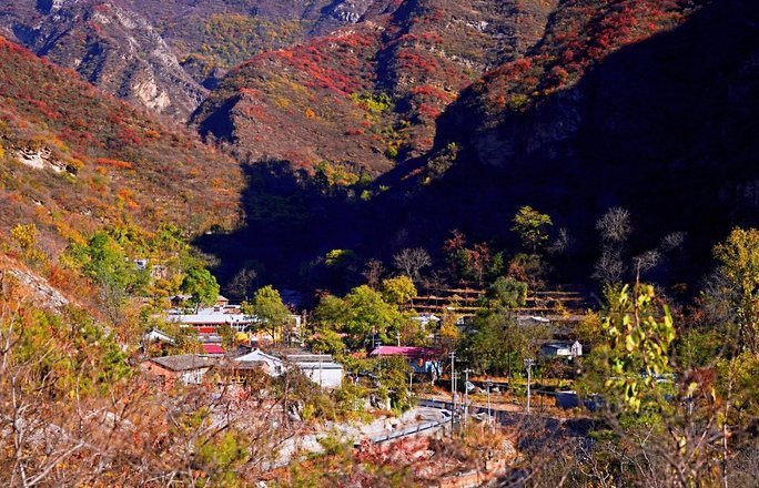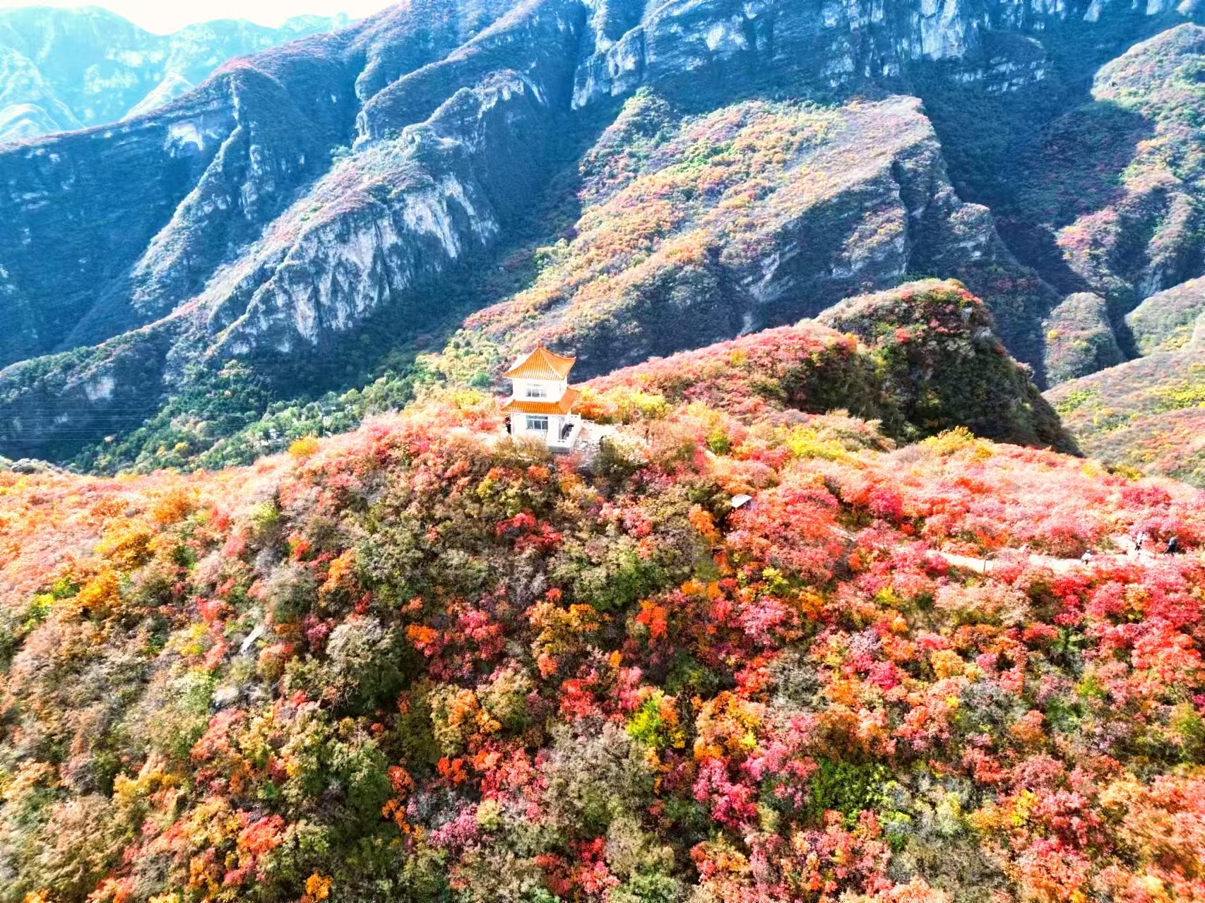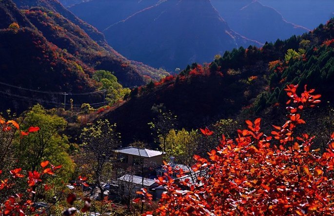 10:30➤左右到达泗马沟•药王谷景区,进入樱桃谷登山步道,一路赏美景拍照。漫步在蜿蜒的石道,红叶随行,连绵起伏的山峦上,橙黄红绿,煞是热闹。沿路看秋,叶比花娇,居高远眺,目光所及尽是惊喜。簇簇红叶与茫茫云海相映成趣,云腾山浮,飘渺如画,不同树种的叶子,红黄交错,视觉由远及近,颜色由黄绿相间转向浓红淡黄,迥然不同的色彩,放眼望去层峦迭嶂红叶漫山,把整个药王谷点缀的如童话仙境般美妙。药王谷红叶几乎全都是黄栌,其壮观但却并不单调,因为起起伏伏的山脉,自然随性生长。