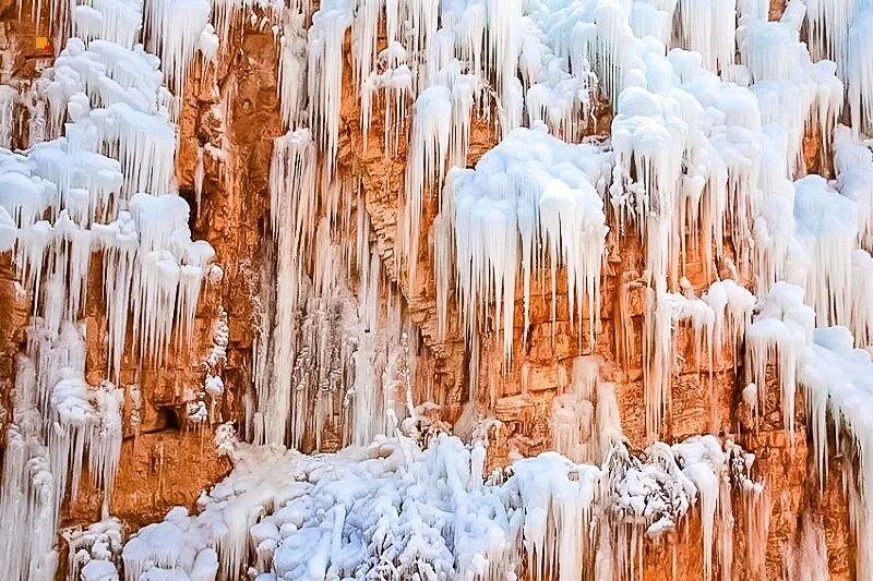 云瀑沟因沟中溪水、瀑布众多而得名,冬季时,这些溪水、瀑布凝结成壮观的冰瀑。高耸的崖顶上,冰瀑宛如银装素裹的绸带蜿蜒垂落,在阳光照耀下闪烁光芒。千姿百态的冰瀑和冰挂,或圆润如玉,或修长雅致,在蓝天映衬下更显梦幻。