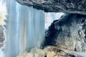 山谷深处,一道高10米、宽5米的冰面飘于崖边,像壮美的瀑布一样,冰瀑右下边的冰面已经被“撕破”,露出后面的凹型空洞,宛若花果山上的水帘洞。洞口的冰瀑珠帘玉垂如在开半帘的厚重帏幕帘,让洞里充满神秘感。近距离接触冰瀑,由上而下的流水冻结了各种姿态的冰瀑,非常震撼,两边黝黑的岩石衬托着冰瀑更加洁白迷人。