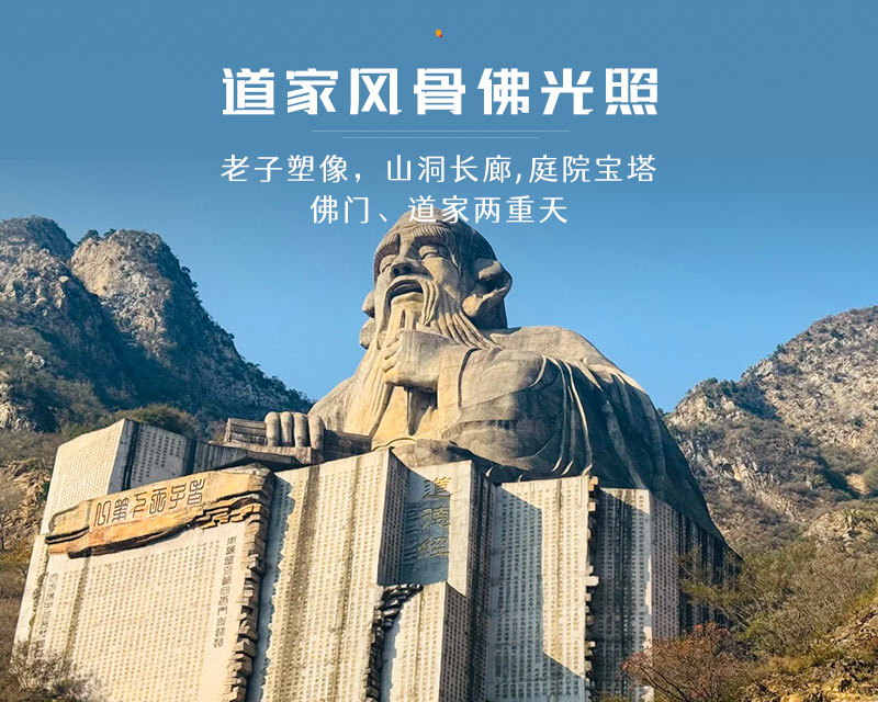 圣莲山自然风光所带来的震撼中,抬头,睁眼所现,却被这尊巨大的老子像所惊叹!《道德经》镌刻于此,石像、经书,浑然一体,仿佛诉说着只有灵性十足的人才能感知到的宇宙奥秘。一生二,二生三,三生万物。对你来说,这凤毛麟角的至真至理,却可能用一辈子的经历来慢慢领悟。于是,圣莲山的道家文化,便不言而喻、昭然若揭了。