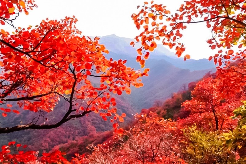 当你看惯四季青翠的绿色,再来看看远比北京香山更大、更为壮观的场面时,色调的转换,视角的渲染,色彩的冲击,都会给你一种出乎意料的享受。沿山路北行还可到达依山傍水的麻衣寺景区。