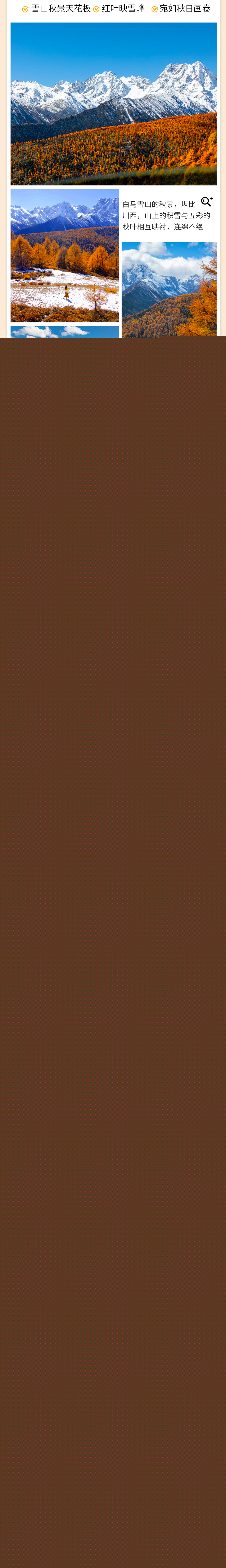 【白马雪山垭口】,这里的视野极其开阔,秋景极佳,堪称一绝。深秋的白马雪山,层林尽染,雪山,蓝天,初雪,黄林,绘出一幅唯美画卷。红叶映雪峰,简直就是赏秋天花板。