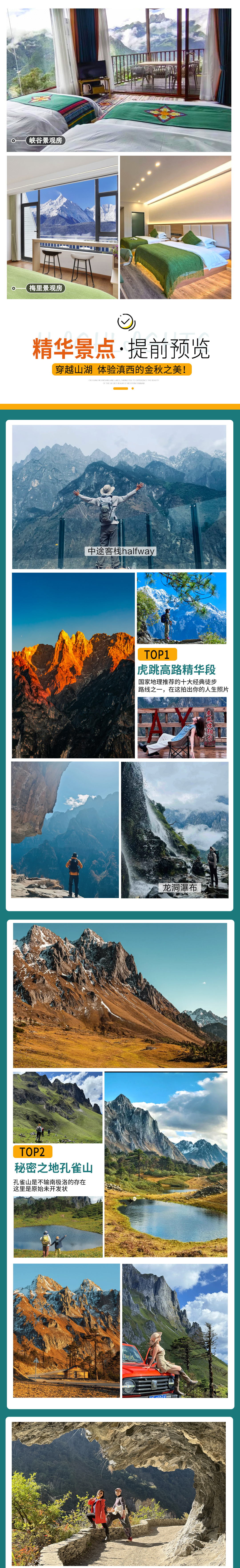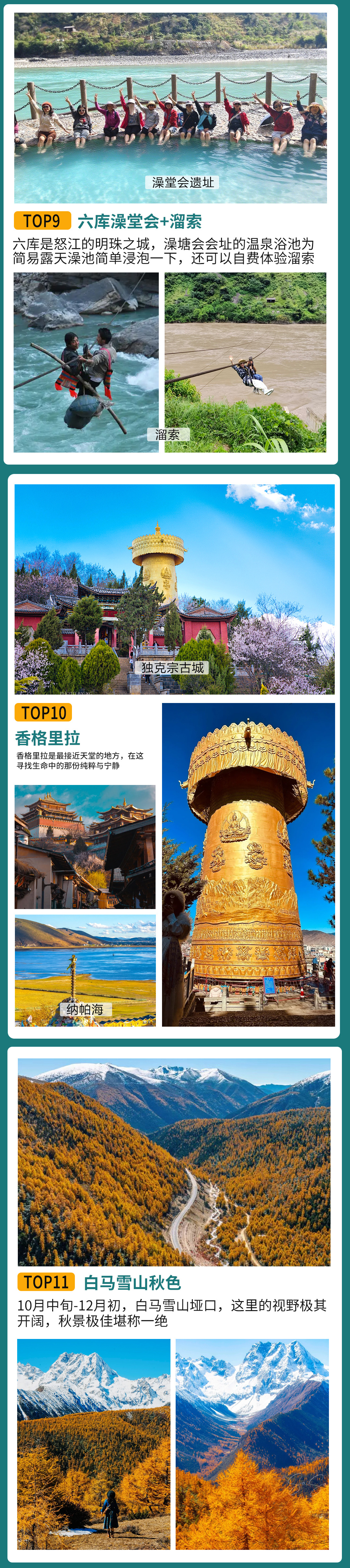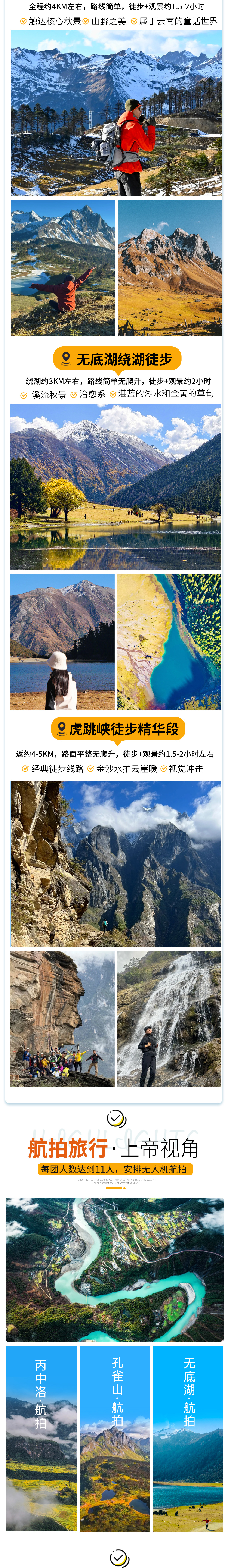2、【景点及门票】:怒江大峡谷、独龙江、丙中洛、老姆登、茶马古道、雾里村、孔雀山、滇藏界、飞来寺观景台、金沙江大拐弯、白马雪山、纳帕海、无底湖(含卫生费)、中虎跳峡门票(含接驳车)、白水台门票。