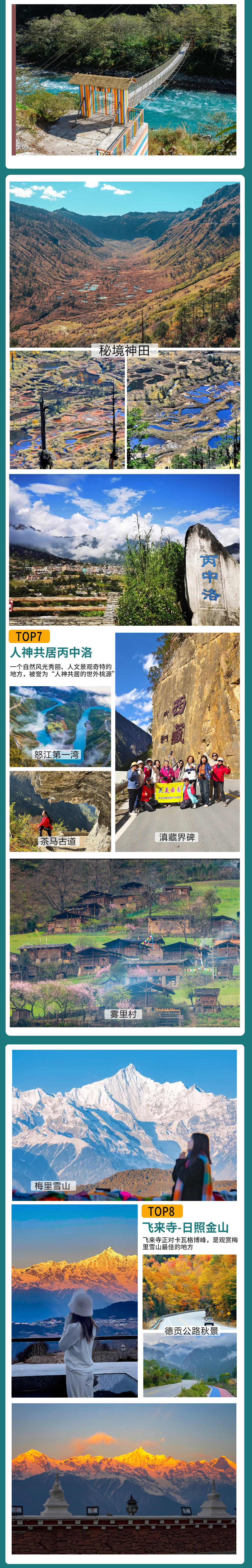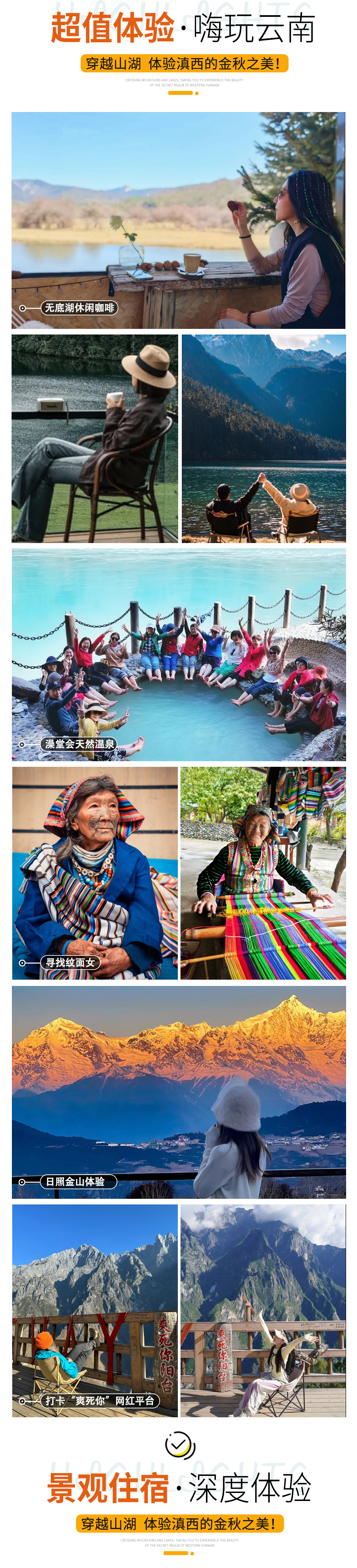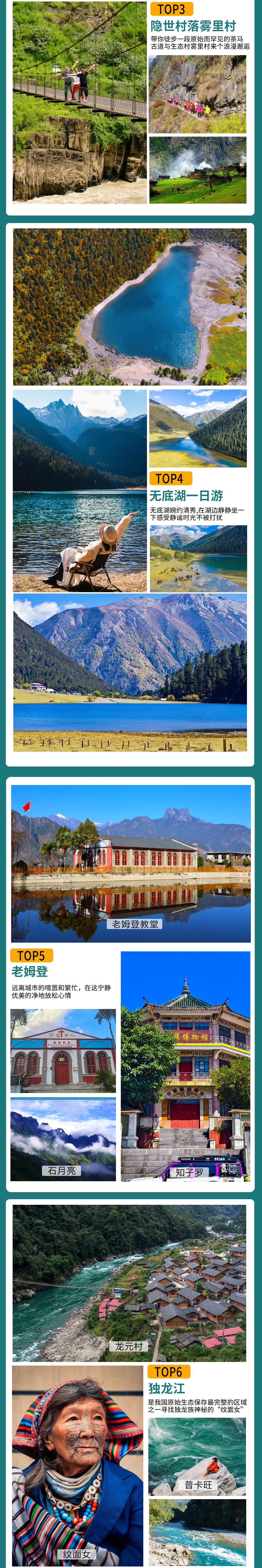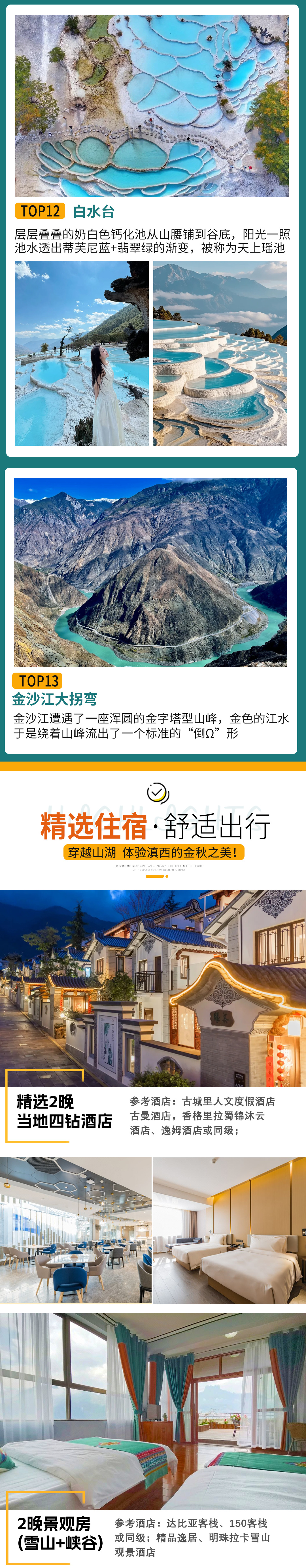 2、【景点及门票】:怒江大峡谷、独龙江、丙中洛、老姆登、茶马古道、雾里村、孔雀山、滇藏界、飞来寺观景台、金沙江大拐弯、白马雪山、纳帕海、无底湖(含卫生费)、中虎跳峡门票(含接驳车)、白水台门票。