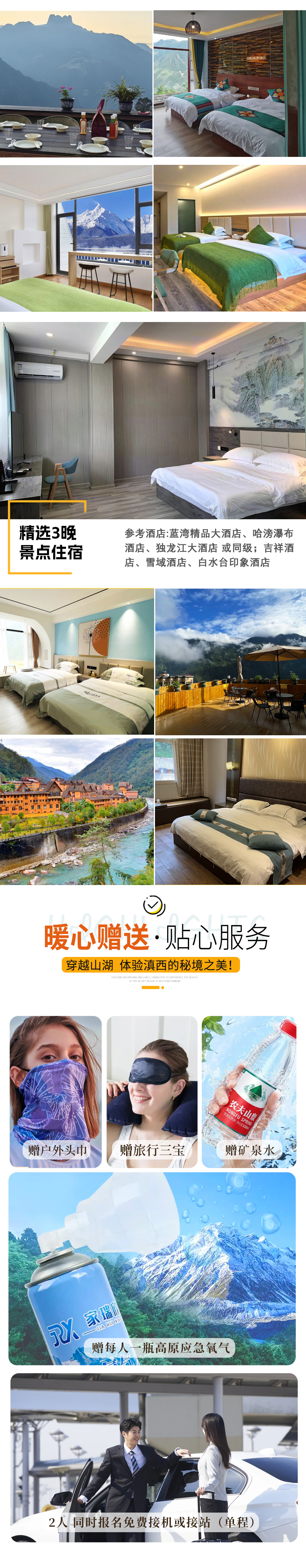 3、【住宿】:7晚酒店标间住宿费:(2晚四钻酒店+1晚峡谷景观房+3晚景点住宿+1晚飞来寺景观房的搭配组合,留更多时间在景点游玩。)