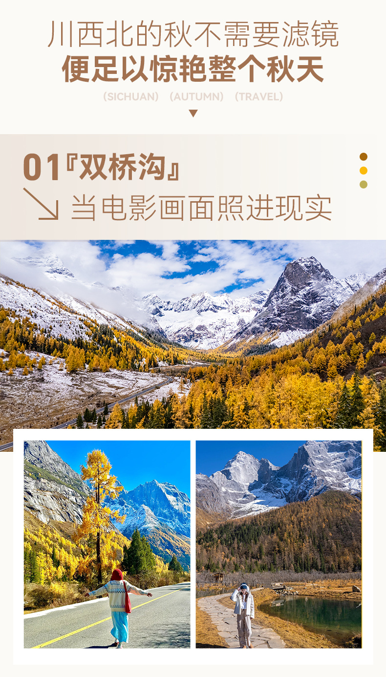 上午:早餐后出发,沿熊猫大道,途经卧龙抵达四姑娘山镇,中午到达【双桥沟景区】,双桥沟的秋色是醉人的,每年10-11月为红叶彩林的最佳观赏期,数十里彩林带从谷底到山巅绵延不断。大约游览3-4小时。