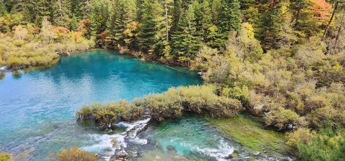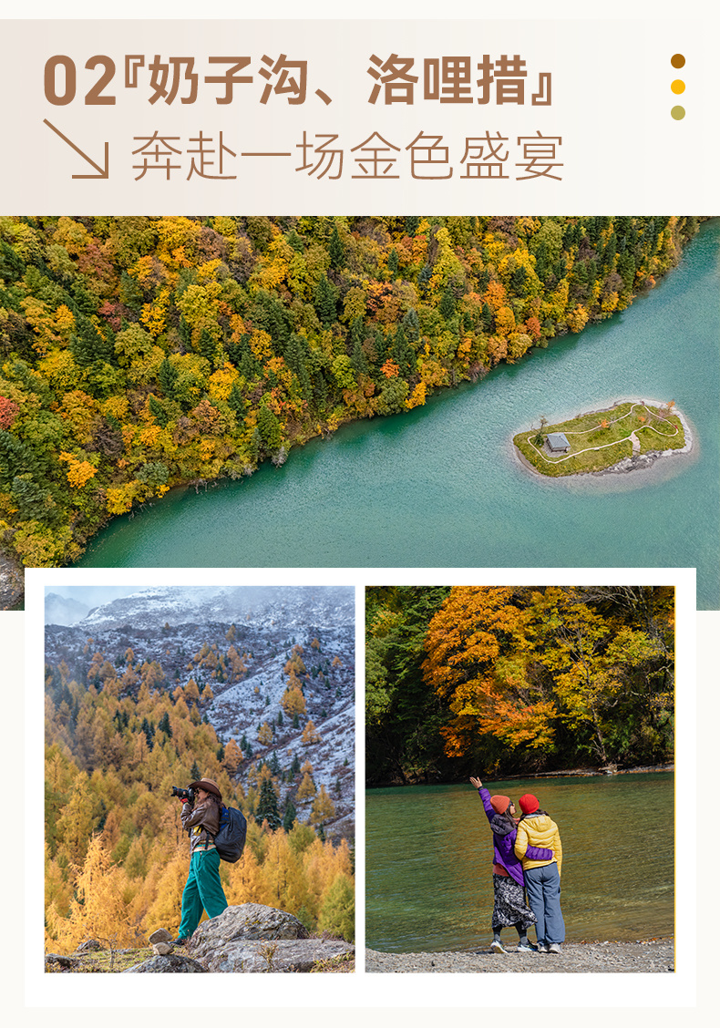 上午:早餐后前往【奶子沟】,这是川西观看彩林最集中的地方,我们在山路中蜿蜒,一大片湖水从一处山弯后铺开,呈现在我们眼前“森林中的湖泊”【洛哩措】。