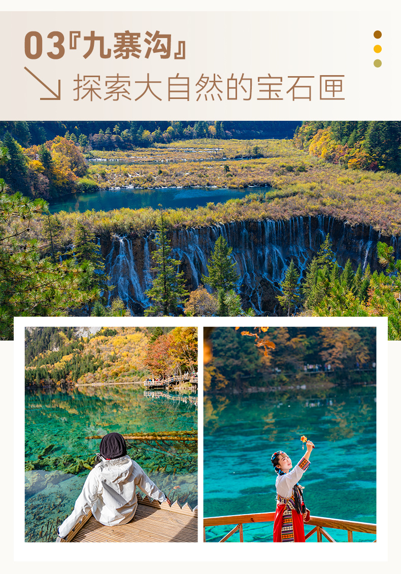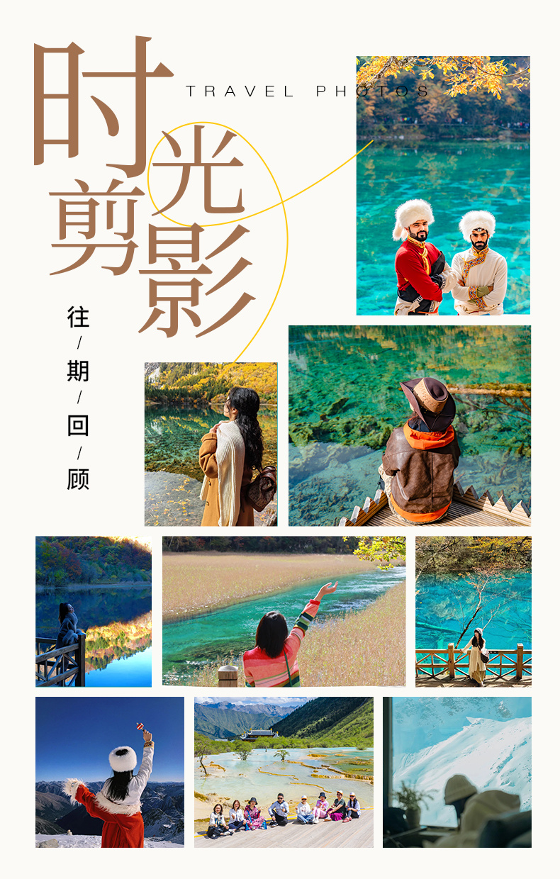 上午:早餐后前往世界自然遗产保护区【九寨沟】跟着观光车游览(景区呈Y字型三岔口)先送到最高点,从上往下,五彩池,花海,珍珠滩瀑布,诺日朗瀑布,树正群海,树正瀑布......风景优美,海子里湖水光芒奇异,瀑布宏伟壮观!中午的时候,大家可以在诺日朗中心站稍作休息!今天咱们有一整天的时间在九寨沟里面欣赏美景,美景配好Poss是最搭调的哦!