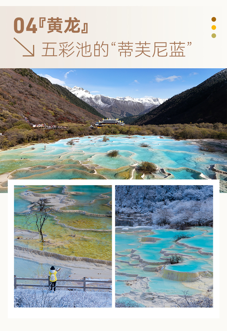 早上:黄龙景区(游览3-4小时)途可欣赏迎宾池、飞瀑流辉、洗身洞、盆景池等。体力有限的游客建议索道上山(80元),步行下山;