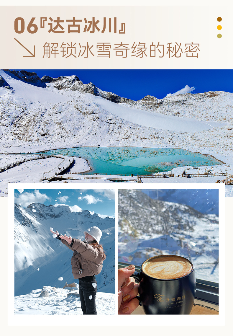 早上: 达古冰川(游览4小时),全球海拔最低冰川,乘索道登顶观“一号冰川”,打卡孤独咖啡屋(世界最高海拔咖啡馆之一)。