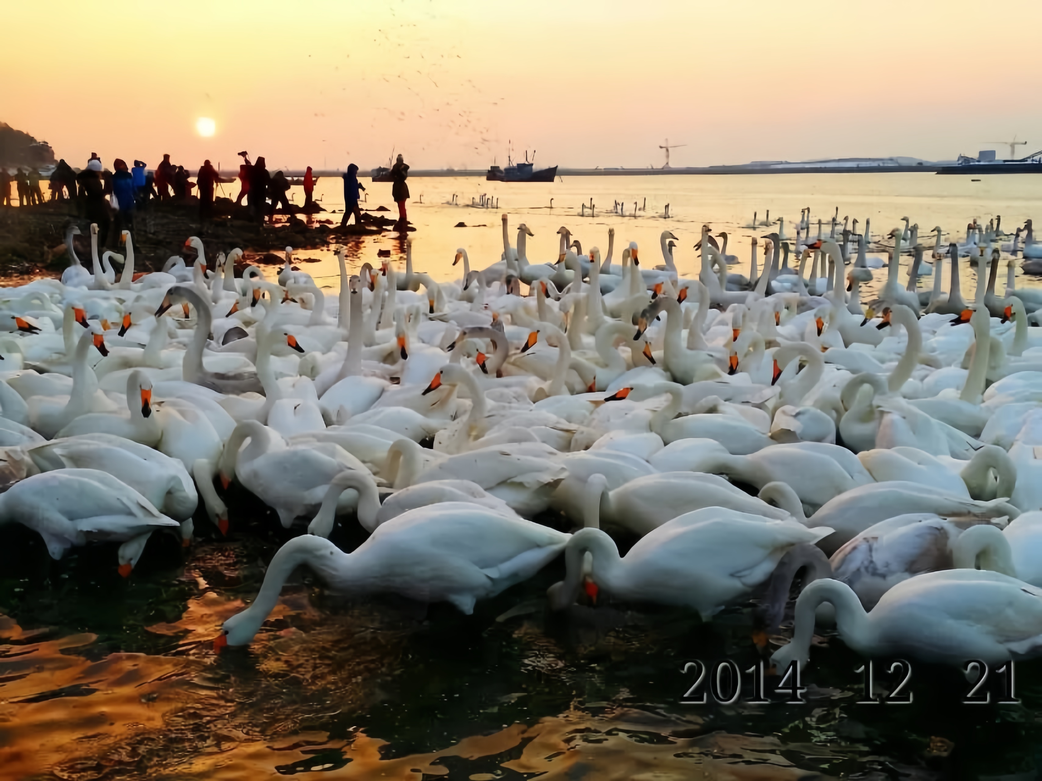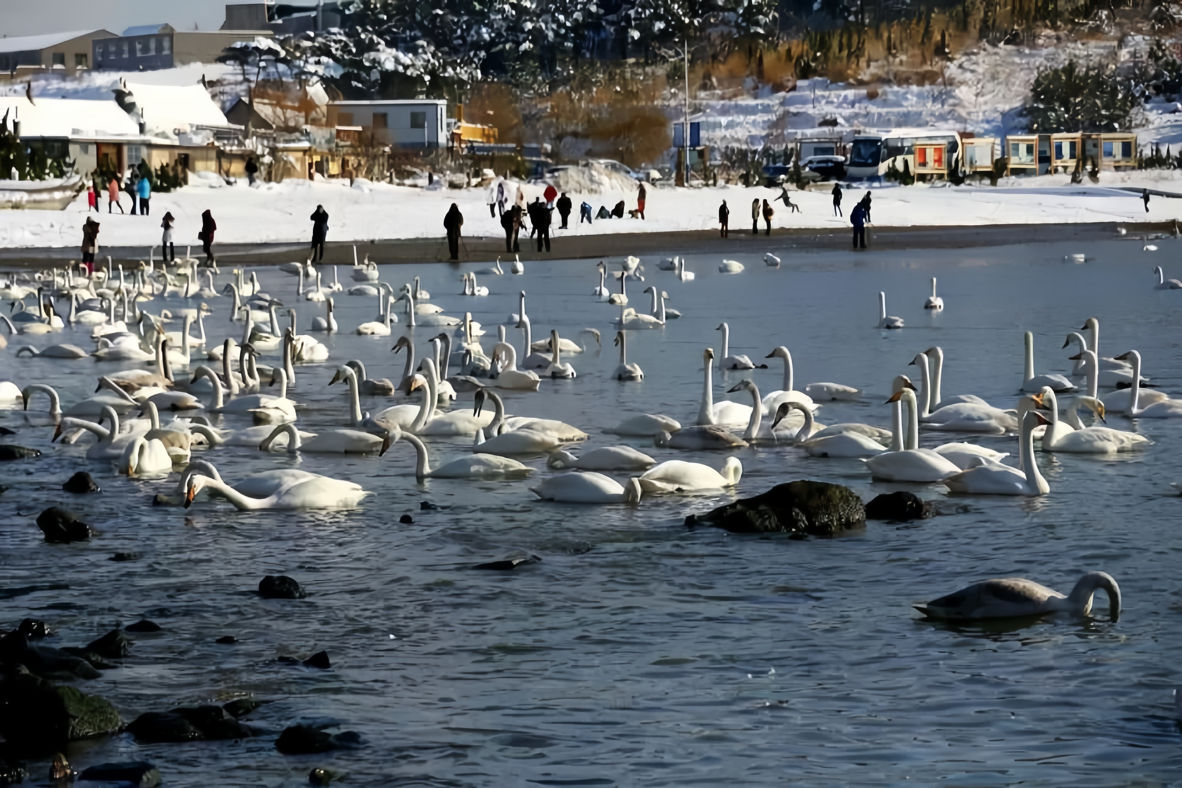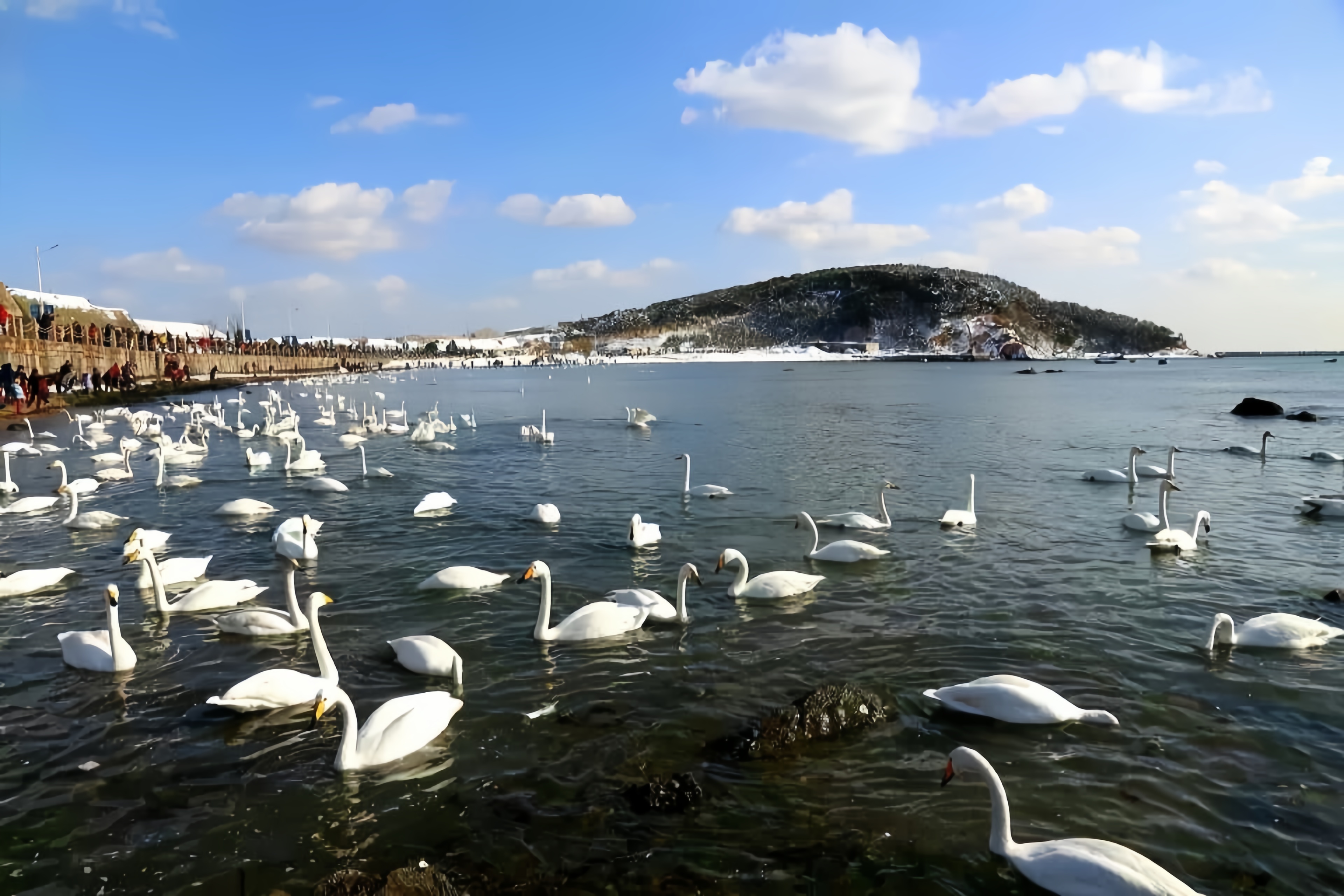 每年十月份以后,大批的天鹅迎着西伯利亚的冷空气逆风飞翔,不远千里万里,来到荣成过冬。成千上万只野生的大天鹅从遥远的西伯利亚、贝加尔湖、新疆和内蒙成群飞到荣成的海湾和湖泊栖息越冬。