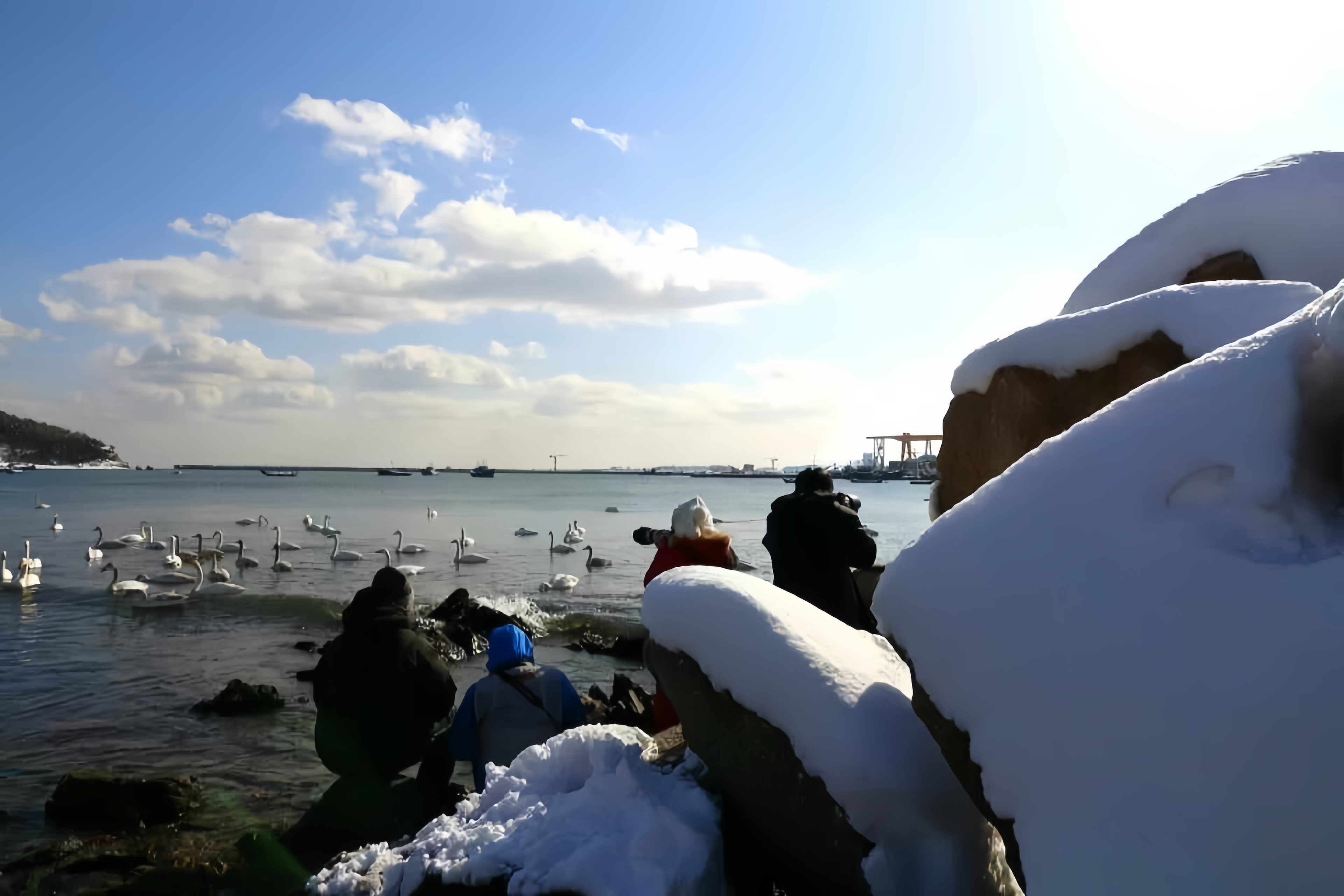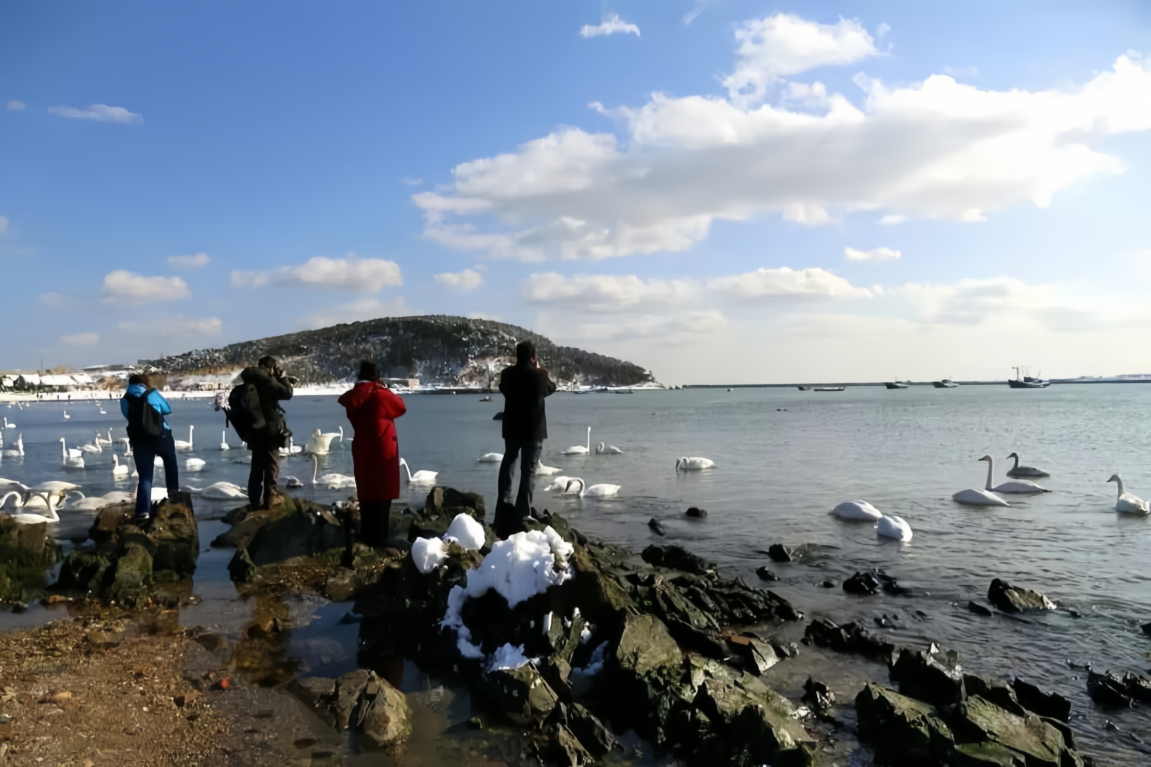 这里是中国最大的天鹅湖,同时为世界上四大天鹅湖之一。天鹅、白雪,冬季的大海别有一番美丽。整个观天鹅海岸线约3公里,终点到花斑彩石参观,花斑彩石是五亿多年前寒武纪燕山期火山喷发的火山岩。