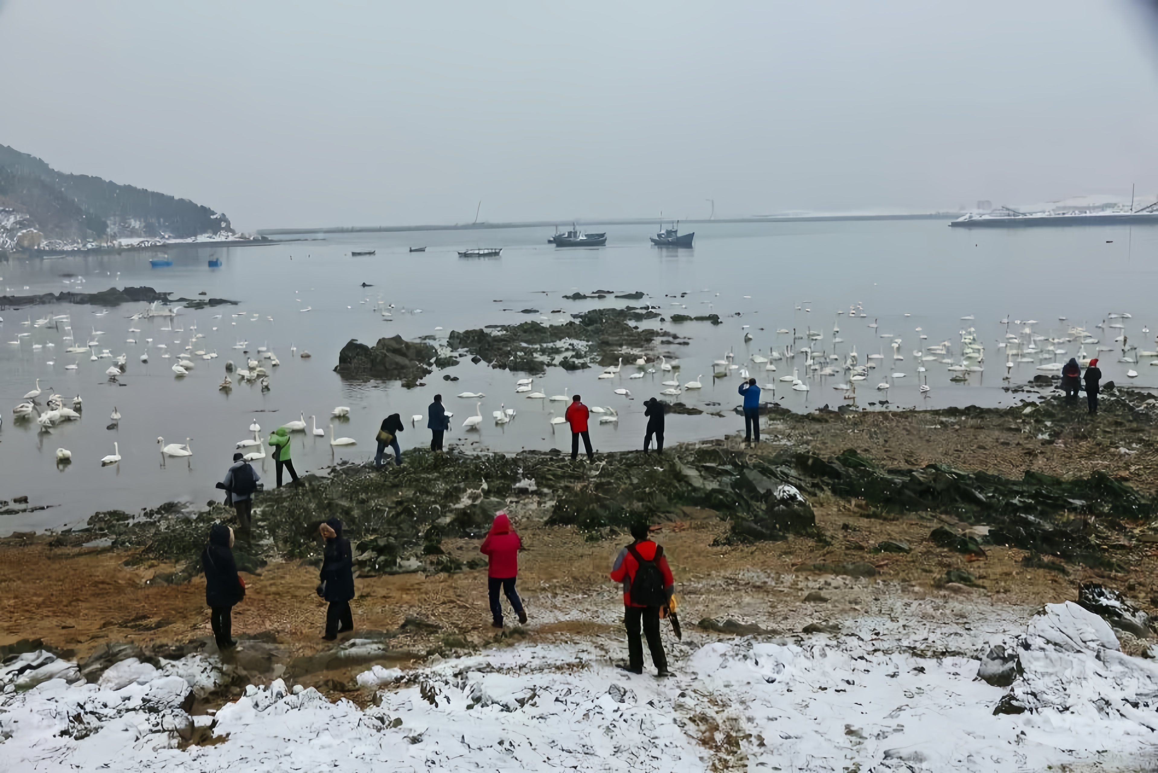 - 早餐后(时间紧可能是打包早),我们乘车前往烟墩角村,大约中午时分到达天鹅湖,集体午餐安排住宿后,大家开始和天鹅亲密接触的一整个下午了。在海边与来自西伯利亚的天鹅近距离亲密,想喂天鹅的可提前准备玉米,海边也有卖的。